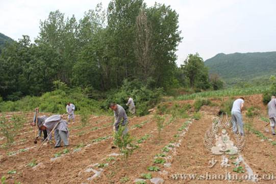 少林寺租種了一千五百餘畝山地,經過幾年的辛苦開墾,目前已有幾百畝地可供播種、耕作。秉承著禪寺農禪並重、自給自足的理念,少林寺禪耕農場上既種植了小麥、油菜、向日葵等農作物,還種植了杏子、桃子、梨子、李子、核桃、西瓜、石榴等果木,以及各種蔬菜,為寺院四百餘位僧眾提供了豐富的糧食、瓜果、蔬菜等。今年農場上種植了一百二十餘畝小麥,可收穫小麥十萬斤,既能滿足寺僧及少林寺慈幼院師生全年的糧食供給,又能儲存一部分,隨時周濟一些貧困家庭,如少林寺每月開展的「少林慈善行」活動,就會給多家貧困的家庭送去米麵糧油等愛心物品。